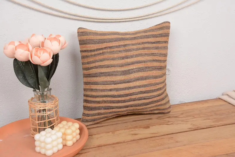Beige & braun gestreiftes Wurfkissen, Vintage besticktes Kissen