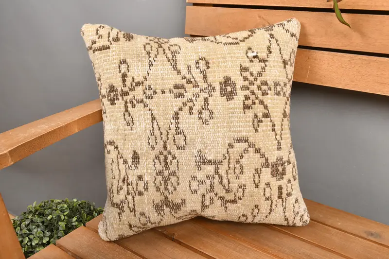 Beige & Braun besticktes Blumenkissen, handgemachtes Vintage Kissen