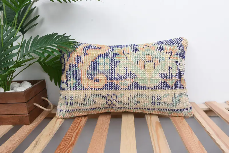 Blaues und beiges Southwestern-Wurfkissen, handgefertigtes Kissen aus Leinen und Wolle