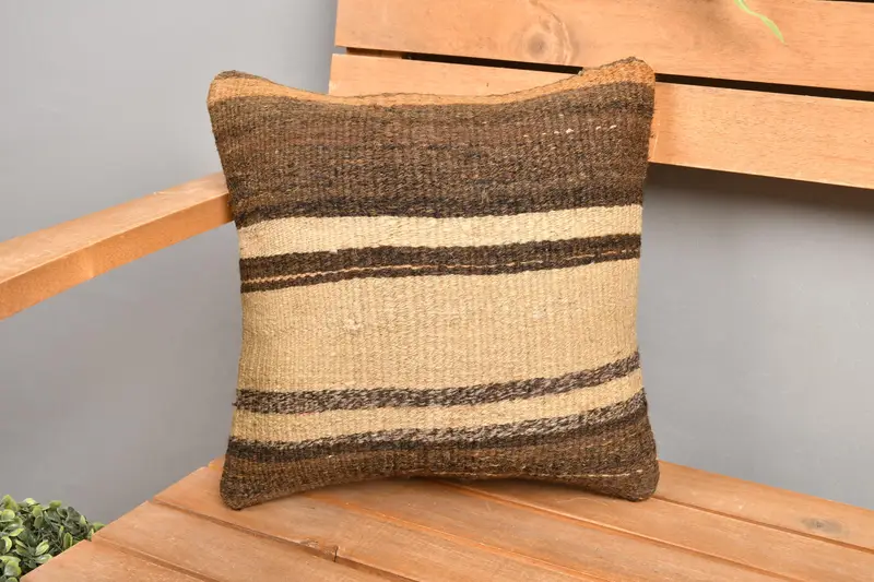 Braun & Beige gestreiftes Kissen, besticktes Vintage Kissen