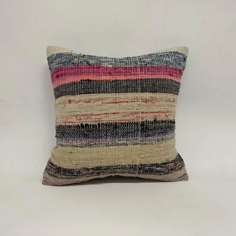 Beige und lila gestreiftes Kissen, besticktes Vintage-Kissen