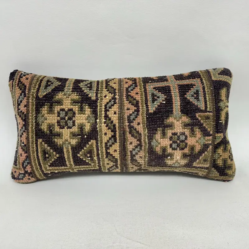 Besticktes Patchwork-Kissen in Blau und Beige, handgefertigtes rechteckiges Wurfkissen