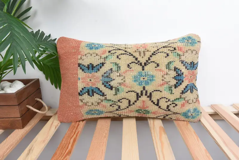Handgefertigtes blaues und beiges Blumen-Wurfkissen, 12x20 besticktes Kissen