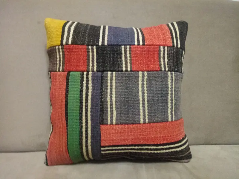 Besticktes grau-rot gestreiftes Wollkissen, handgefertigtes Vintage-Kissen