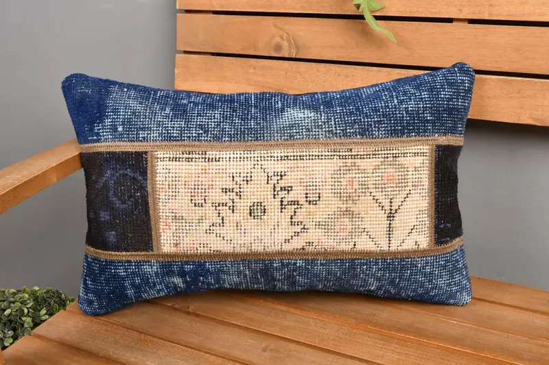 Blaues und beiges Patchwork-Wurfkissen, handgefertigtes besticktes Kissen