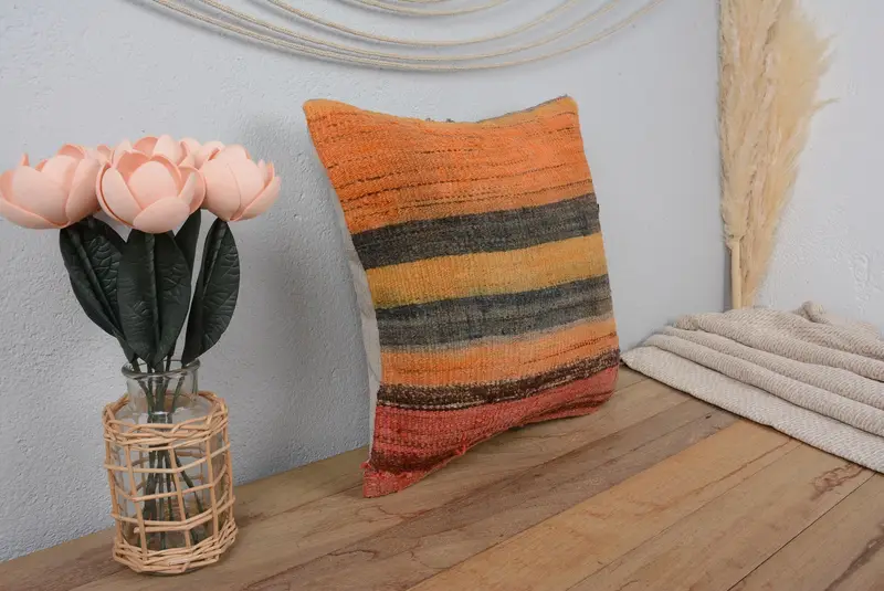 Orange und braun gestreiftes Kissen, besticktes Vintage-Kissen