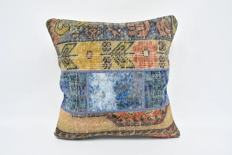 Handgefertigtes blaues und beiges Kissen, 24x24 besticktes Kissen