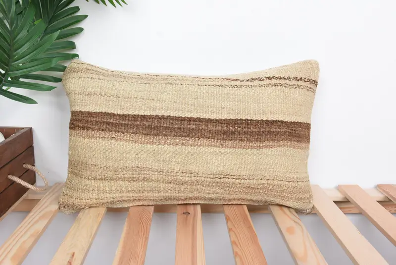 Beige & braun gestreiftes Wurfkissen, besticktes Vintage-Kissen