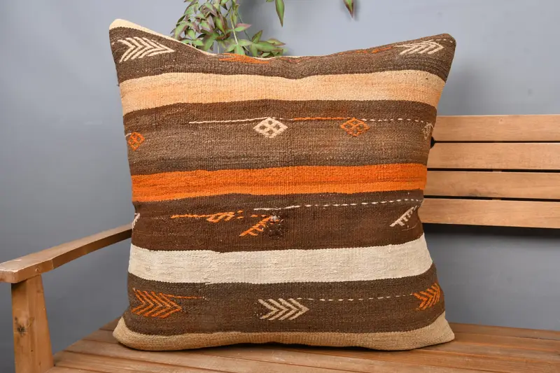 Braun & Beige gestreiftes Kissen, handgefertigtes besticktes Leinenkissen