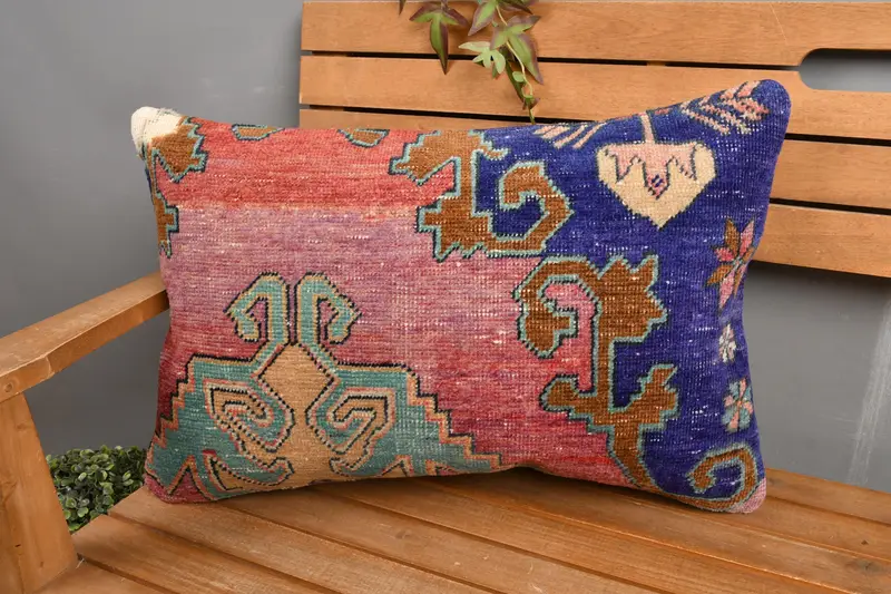 Blau & Rot besticktes Kissen, 16x24 handgemachtes Wurfkissen