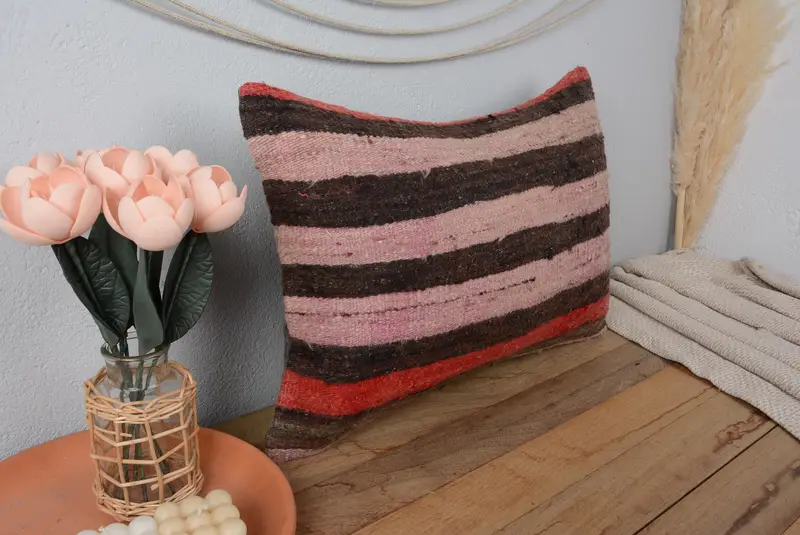 Rosa Leinen-Wurfkissen mit braunen Streifen, besticktes Kissen