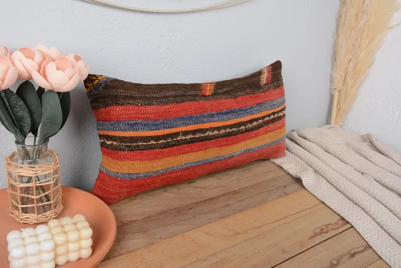 Rot & Orange gestreiftes Wurfkissen, 12x24 handgemachtes Kissen