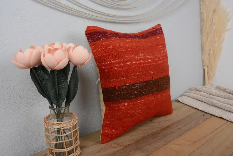Rot-braun gestreiftes Kissen, Vintage besticktes Kissen