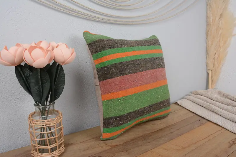 Grün & Orange gestreiftes Kissen, Vintage besticktes Kissen
