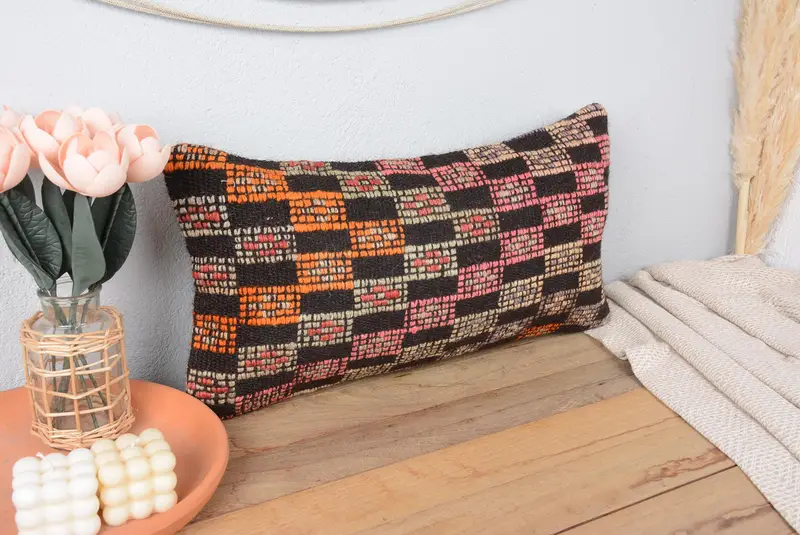 Geometrisches rosa und orange besticktes Wurfkissen, Vintage-Rechteckkissen