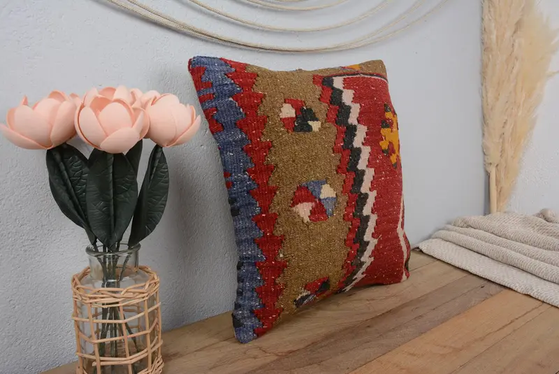 Geometrisches Kissen in Rot und Beige, handgefertigtes Leinenkissen