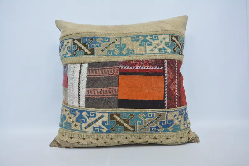Beige & Bronze gestreiftes Hanfkissen, Vintage besticktes Kissen