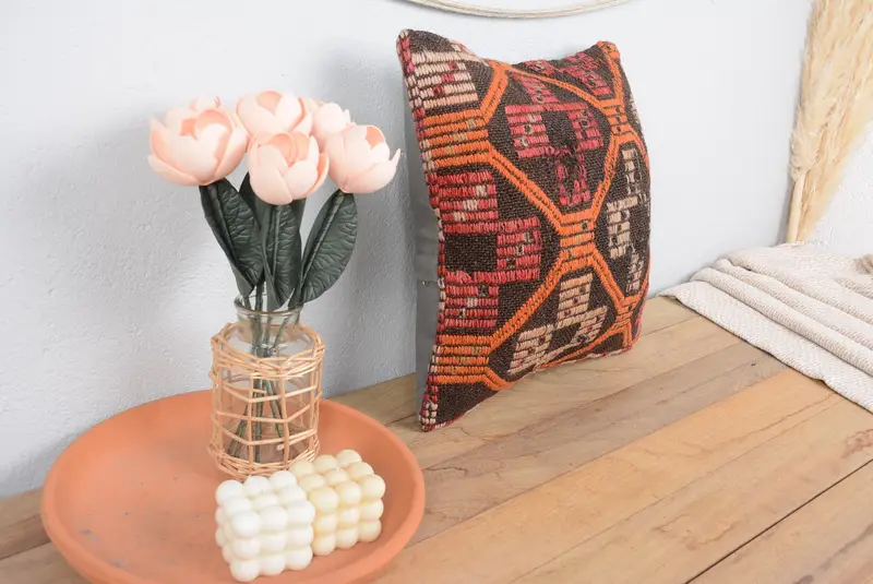 Orange & Braun besticktes Kissen, 16x16 handgemachtes Wurfkissen