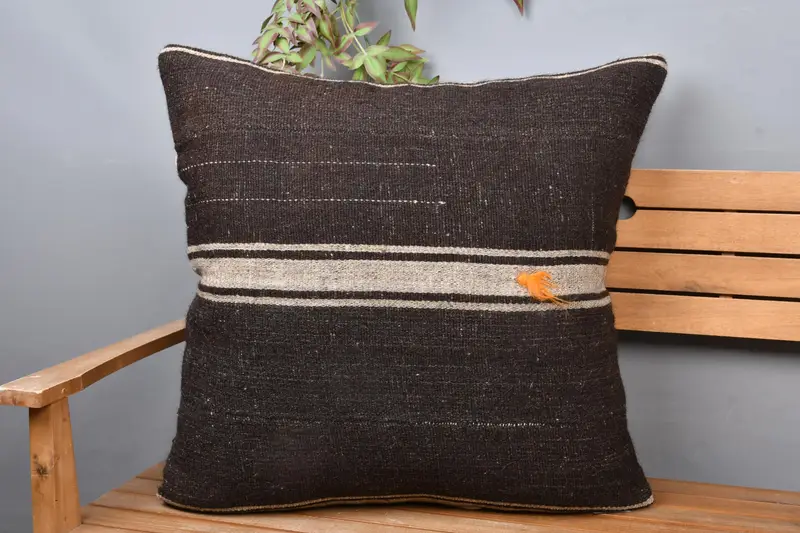 Gesticktes braun-beige gestreiftes Kissen, handgemachtes Vintage-Kissen