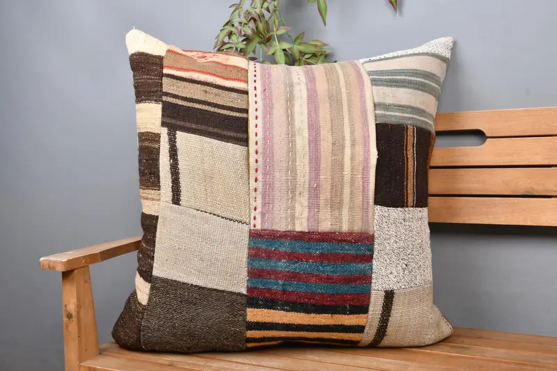 Besticktes Patchwork-Wurfkissen in Beige und Braun, Vintage-Kissen
