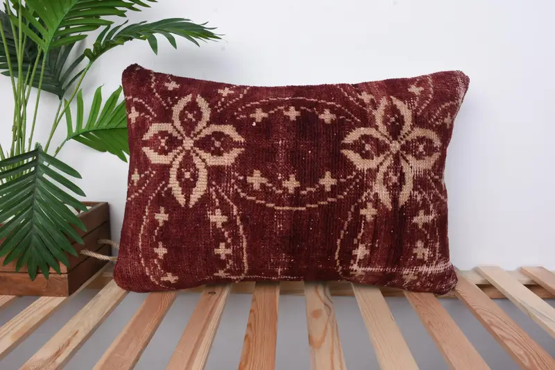 Rot & Beige besticktes Wurfkissen, handgemachtes Vintage Kissen