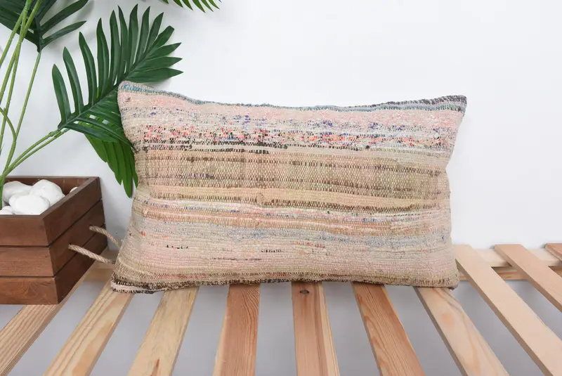 Besticktes Beige & Braunes Wurfkissen, 12x20 handgemachtes Kissen