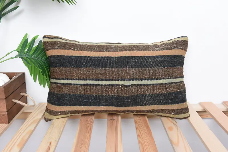Braun & Beige gestreiftes Wurfkissen, 12x20 handgemachtes besticktes Kissen