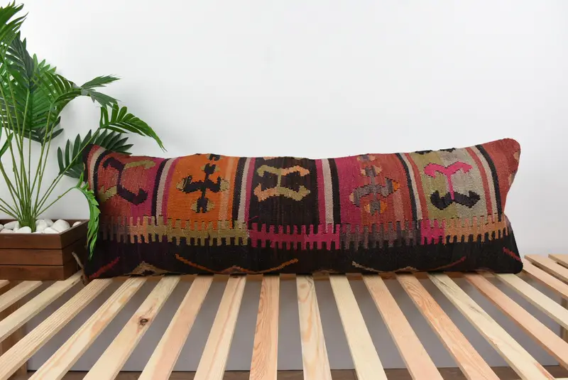 Geometrisches Leinen-Wurfkissen in Braun und Regenbogen, handgefertigtes Vintage-Kissen
