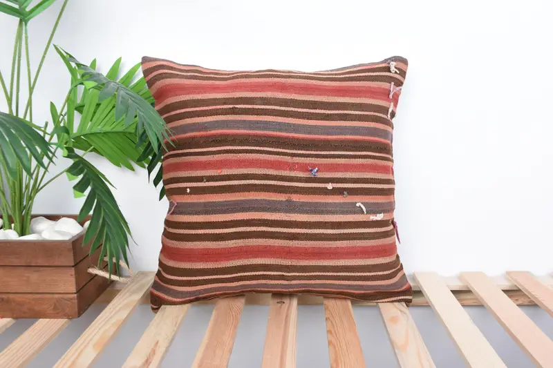Rot-braun gestreiftes Kissen, handgefertigtes besticktes Leinenkissen