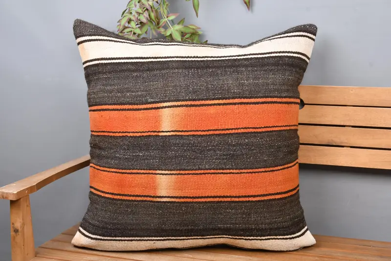 Braun und Orange gestreiftes Kissen, Vintage besticktes Kissen