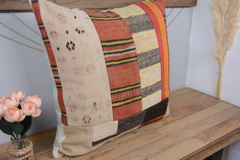 Rot & Orange besticktes Patchwork Kissen, Vintage handgemachtes Kissen