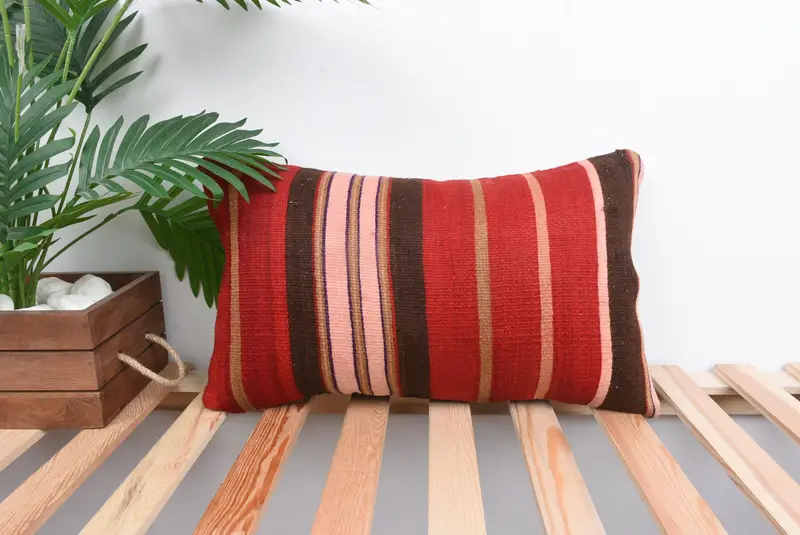 Rot-braun gestreiftes Kissen, handgefertigtes besticktes Leinenkissen