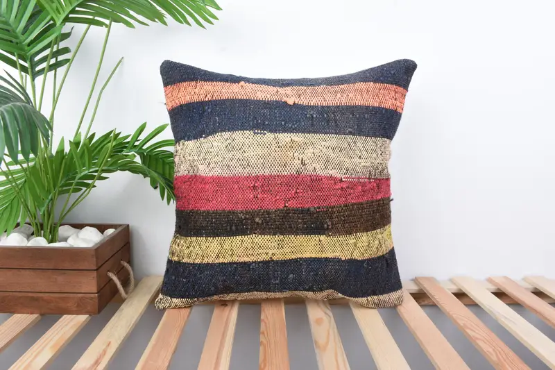 Blau-rosa gestreiftes Kissen, besticktes Vintage-Kissen