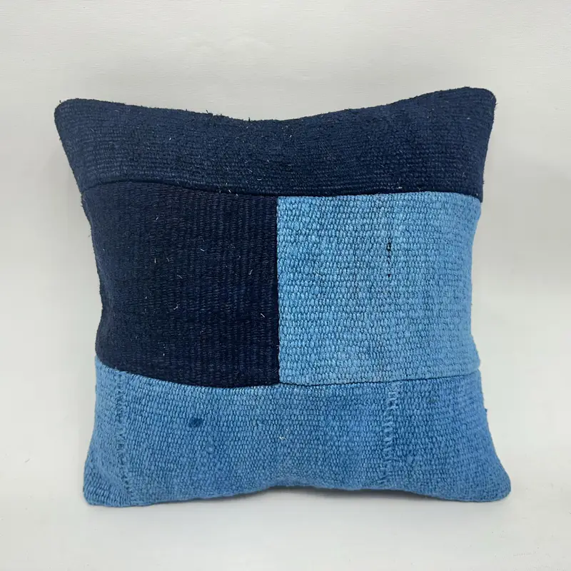 Besticktes Patchwork-Wurfkissen in Blau und Bronze, handgefertigtes Vintage-Kissen