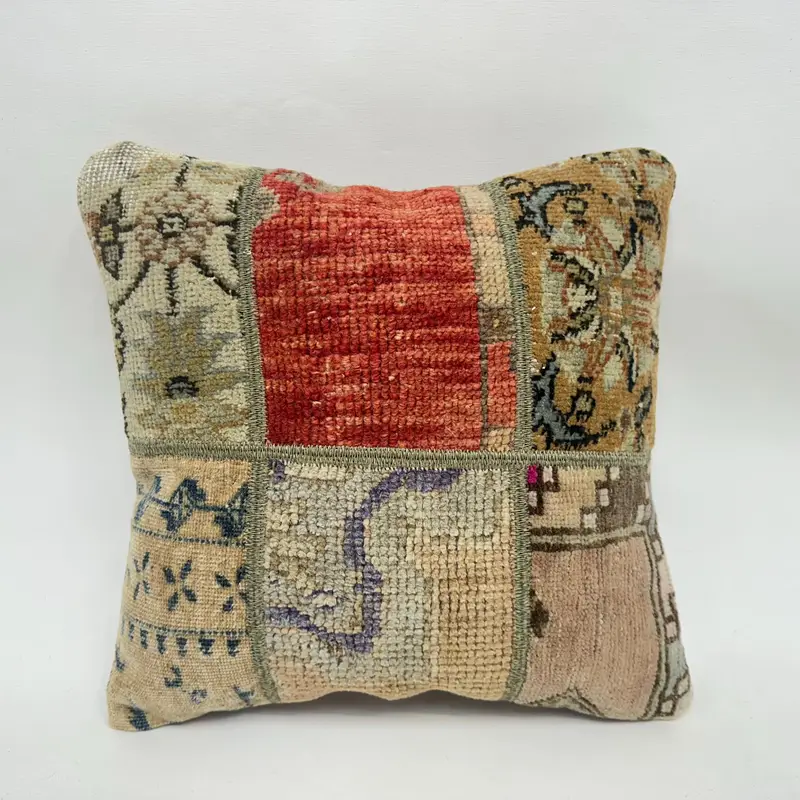 Besticktes Patchwork-Wurfkissen, 16x16 handgemachtes Vintage-Kissen