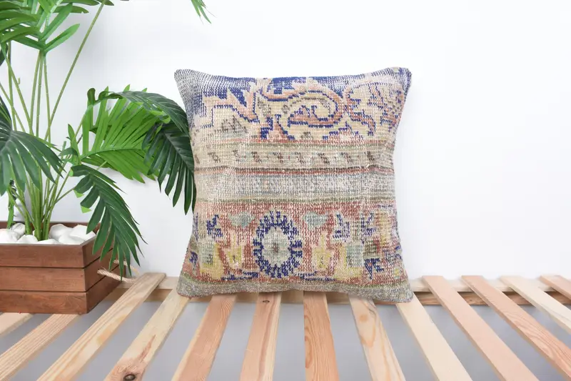 Blau & Grün besticktes Wurfkissen, Vintage geometrisches Kissen