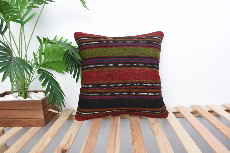 Handgefertigtes grün-rot gestreiftes Kissen, Vintage besticktes Kissen