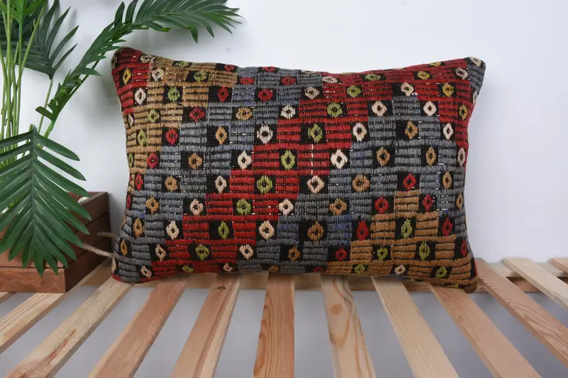 Rotes Leinen-Wurfkissen mit geometrischem Muster, handgefertigtes besticktes Kissen