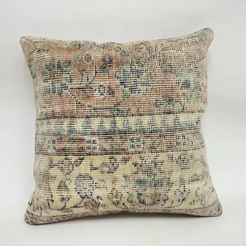 Beige & braunes Blumenkissen, Vintage besticktes Kissen
