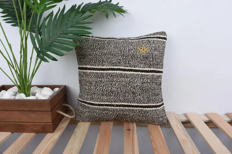 Braun-weiß gestreiftes Kissen, Vintage besticktes Kissen