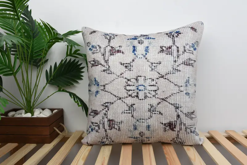 Beige & braun gestreiftes Wurfkissen, Vintage besticktes Kissen