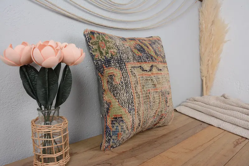 Handgefertigtes besticktes Wurfkissen in Grün und Beige, vielseitiges 16x16-Kissen