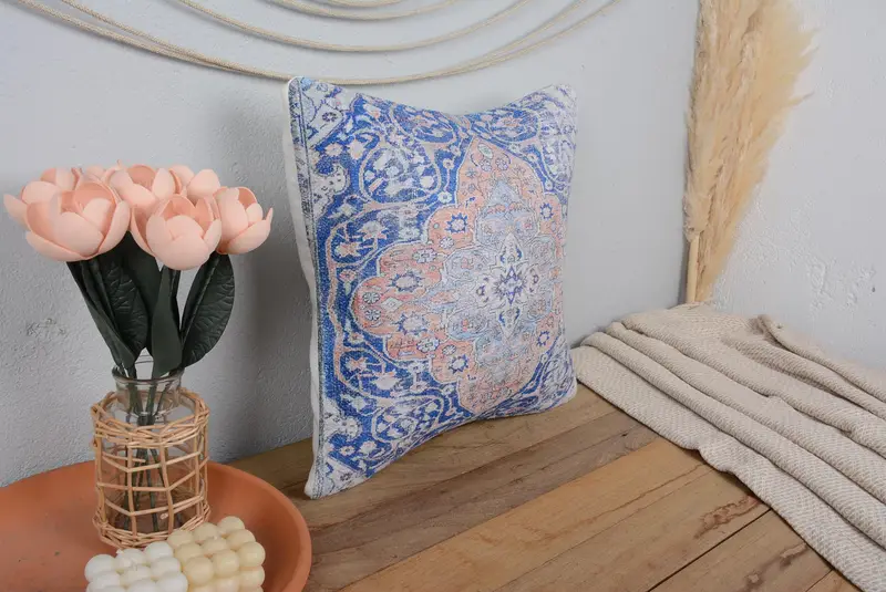 Blaues und orangefarbenes Southwestern-Wurfkissen, 16x16 besticktes Kissen