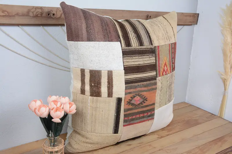 Beige & braunes Patchwork-Wurfkissen, Vintage besticktes Kissen