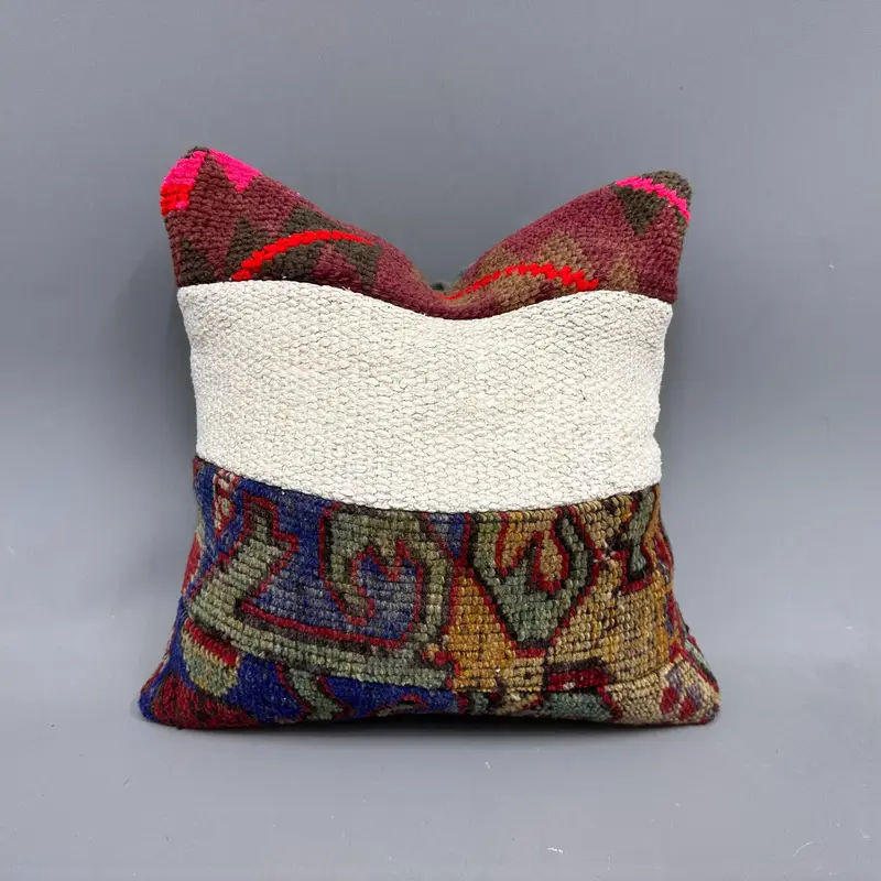 Beige & grünes Patchwork-Wurfkissen, Vintage besticktes Kissen