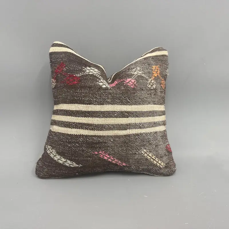 Braun & rot gestreiftes Kelim-Wurfkissen, Vintage besticktes Kissen