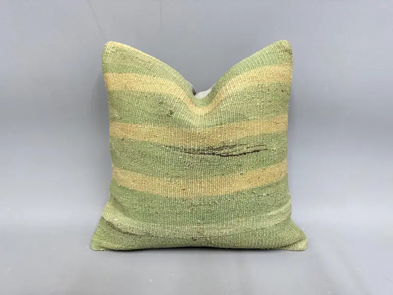 Handgewebtes Kelim-Kissen in Grün und Orange, gestreiftes Vintage-Kissen
