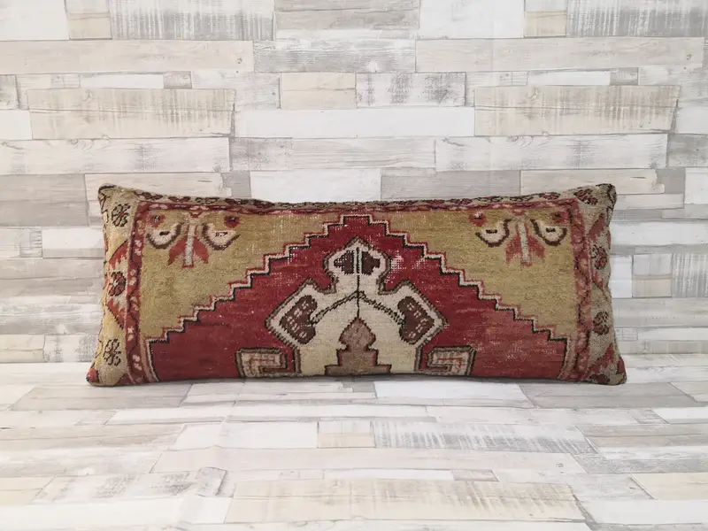 Handgefertigtes Wollkissen, rot-grünes geometrisches Vintage-Rechteckkissen
