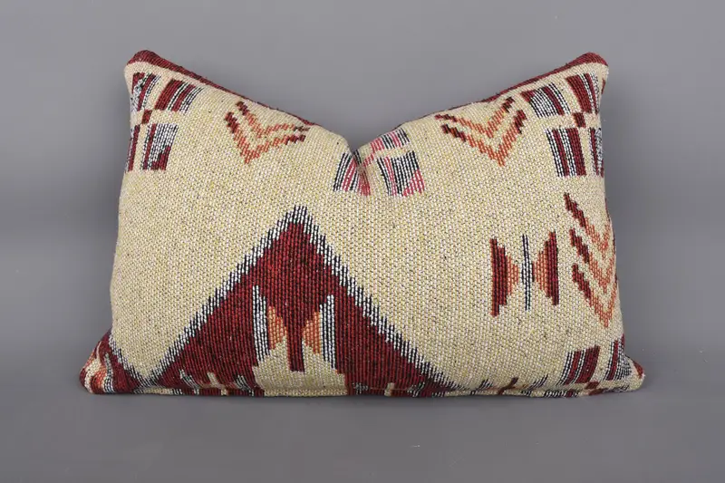 Geometrisch besticktes Kissen, Vintage-Kissen in Beige und Rot