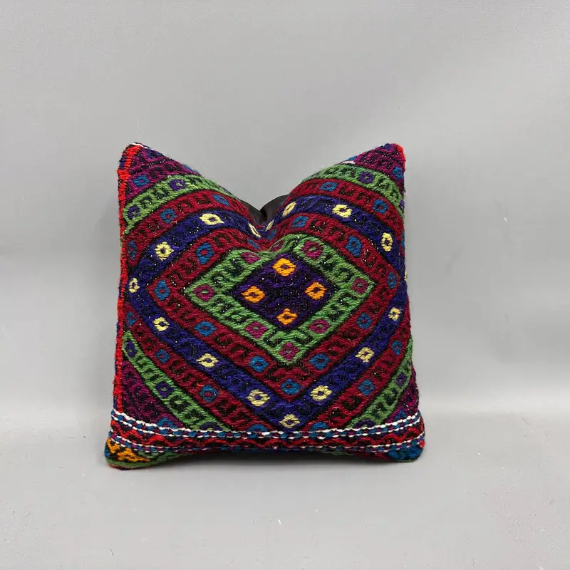 Rot & Grün besticktes Wurfkissen, Vintage geometrisches Kissen